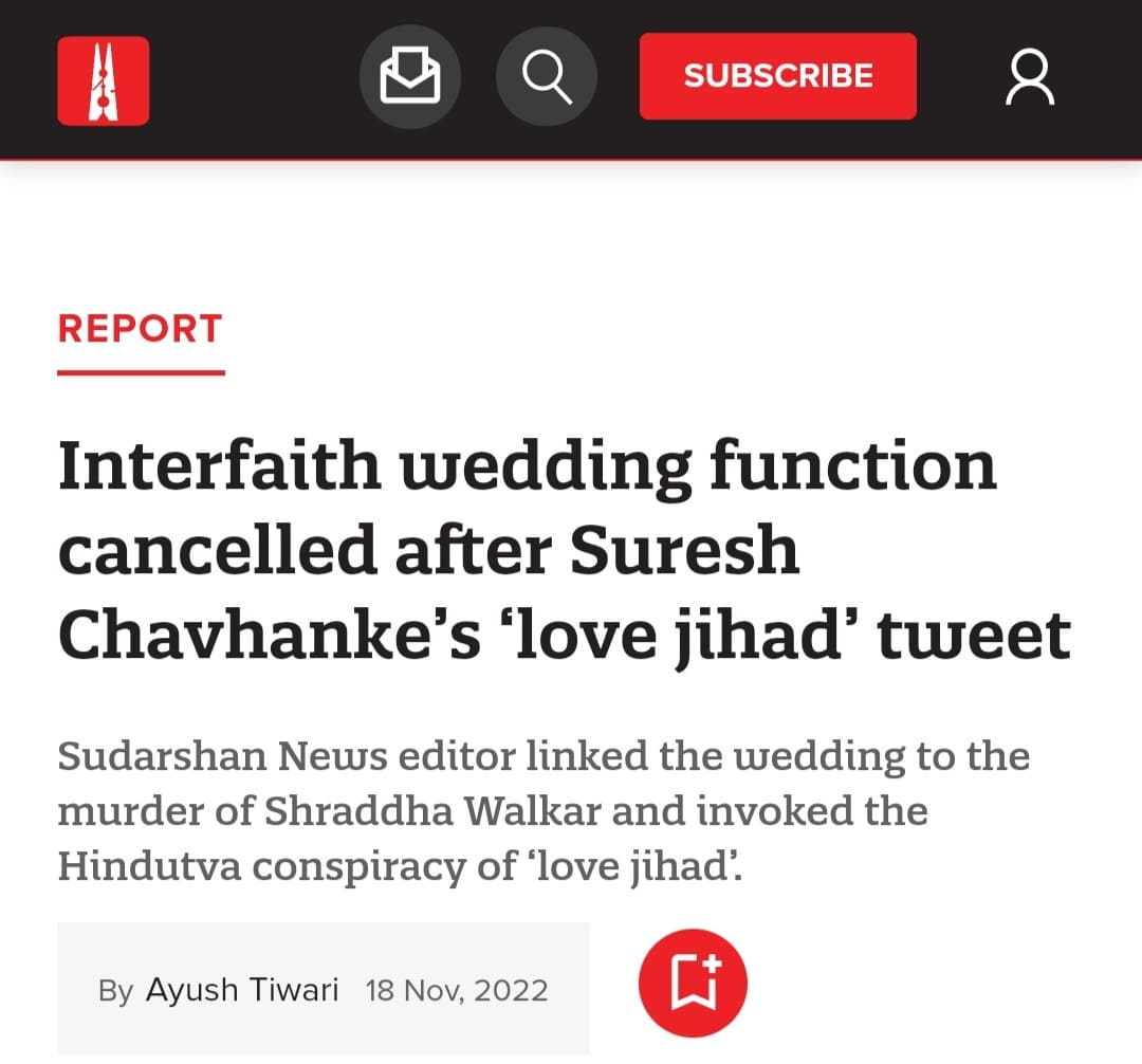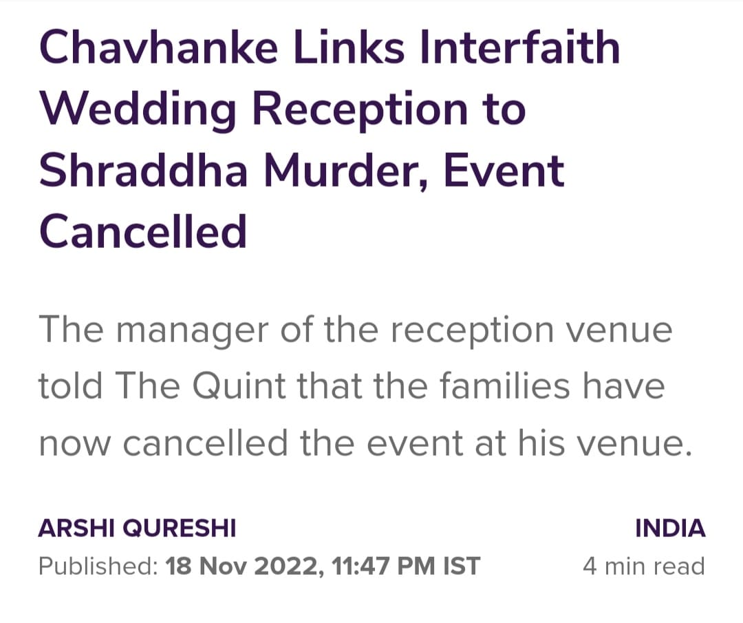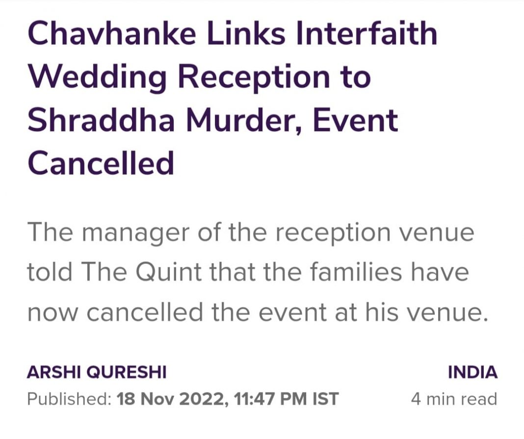 It had claimed, “Hours after Hindutva proponent… Suresh Chavhanke tweeted out details of an interfaith couple’s wedding reception invitation and linked it to the Shraddha Walkar murder case, Imran and Divya were forced to call off their function in Vasai, on the outskirts of Mumbai.”