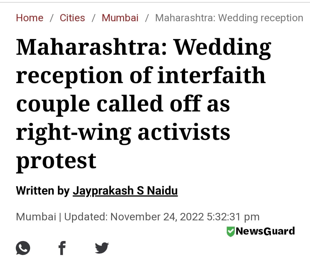 English daily, The Indian Express had published an article titled, ‘Maharashtra: Wedding reception of interfaith couple called off as right-wing activists protest’, was published to this effect on November 24.