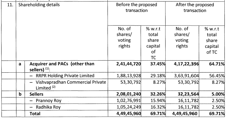 In a regulatory filing with BSE today, NDTV gave details of the share transfer. Prannoy Roy and Radhika Roy held 32.26% share in NDTV in their personal capacity, apart from the holding through RRPR Holding which was already acquired by Adani group earlier. From this personal stake, they have transferred 27.26% of shares to RRPR holding which is now owned by Adani group. After this, the stake of RRPR in NDTV has gone up to 56.45% as it already owned 29.18% stake, while Vishvapradhan Commercial Private Limited, also under Adani group, has 8.27% stake in the media house. Therefore, the total stake of the Adani group in NDTV has gone up to 64.71%, while only 5% remains with the promoters now.