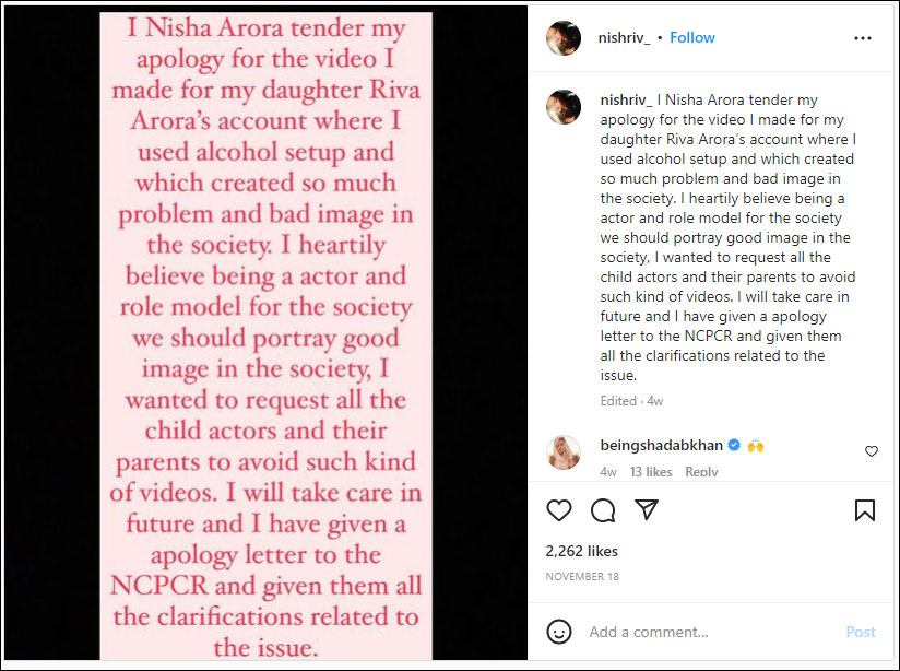 In an Instagram post on November 18, her mother wrote, “I, Nisha Arora, tender my apology for the video I made for my daughter Riva Arora’s account where I used alcohol setup and which created so much problem and bad image in the society. I heartily believe being an actor and role models for society, we should portray a good image in society, I wanted to request all child actors and their parents to avoid such kinds of videos. I will take care in future, and I have given an apology letter to the NCPCR and given them all the clarifications related to the issue.”