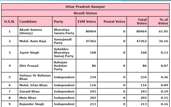 On Thursday, December 8, for the first time, the Rampur Sadar assembly seat has been won by a Hindu candidate. BJP candidate Akash Saxena inflicted a crushing defeat on Samajwadi Party candidate Mohammed Asim Raja, breaching the stronghold of SP’s controversial leader Azam Khan. The historic feat has been achieved after 70 years and 20 assembly elections.