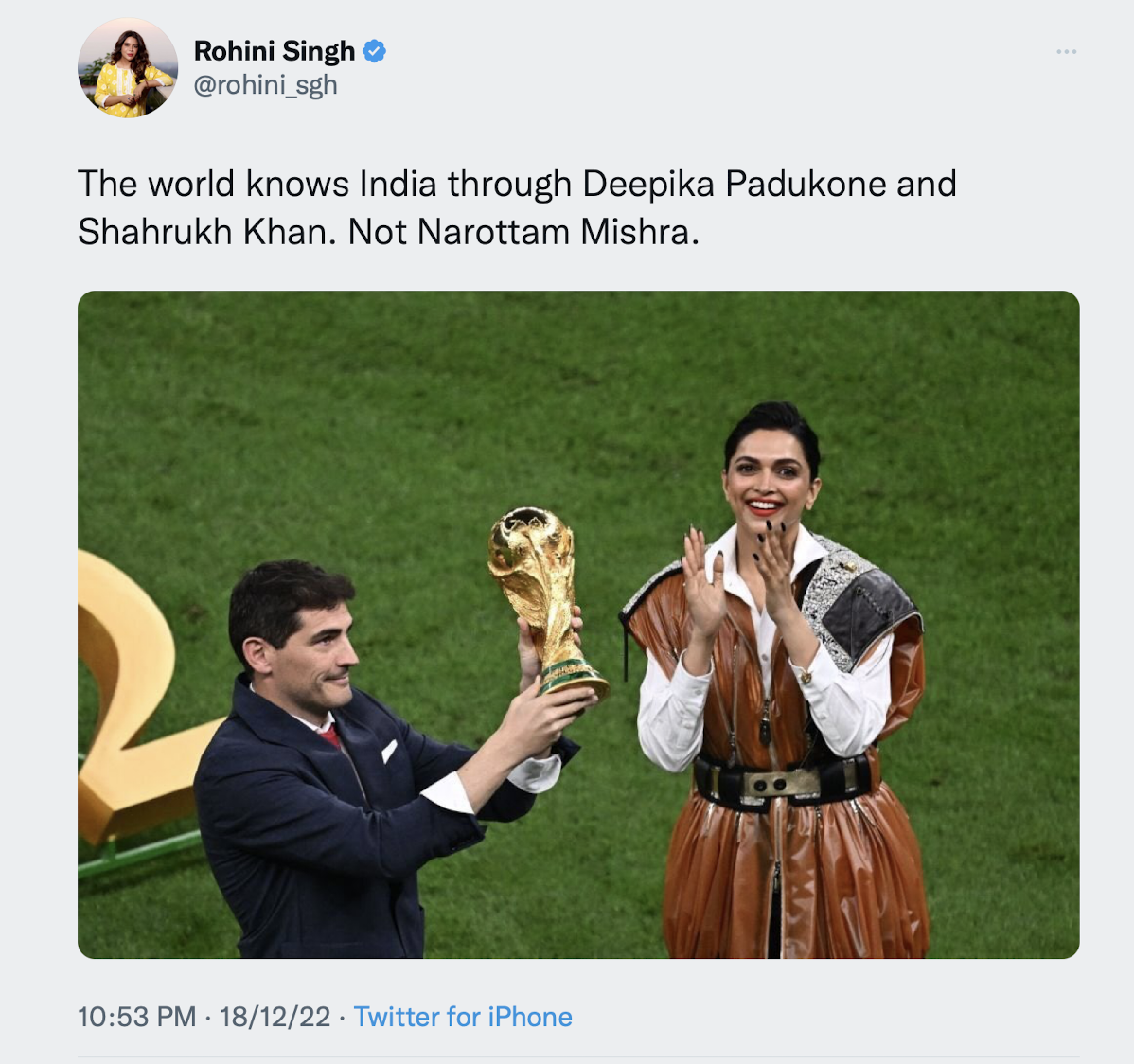 Rohini Singh, a ‘journalist’ with the far-left propaganda portal The Wire, also weighed in on the controversy, pompously claiming the world sees India through Deepika Padukone and Shah Rukh Khan. Singh shared the picture of Deepika Padukone unveiling the FIFA world cup to insinuate that she represented India at the football tournament finals.
