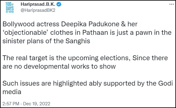 Leader of Opposition, Karnataka Legislative Council Hariprasad BK, said, “Bollywood actress Deepika Padukone & her ‘objectionable’ clothes in Pathaan is just a pawn in the sinister plans of the Sanghis. The real target is the upcoming elections Since there are no developmental works to show. Such issues are highlighted ably supported by the Godi media.”