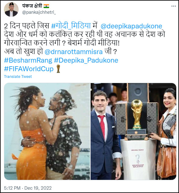 Secretary and Media panellist, Uttarakhand Congress, Pankaj Kshetri said, “Two days back, Deepika Padukone was ‘hurting country and religion’ in Godi Media. Today she is making the country proud. Shameless Godi Media. Are you happy now Dr Narottam Misra Ji?”