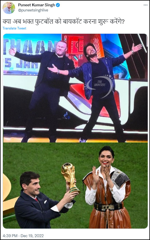 Bolta Hindustan ‘journalist’ Puneet Kumar Singh posted a photo of Deepika and SRK at the FIFA World Cup and asked if people would start boycotting football.
