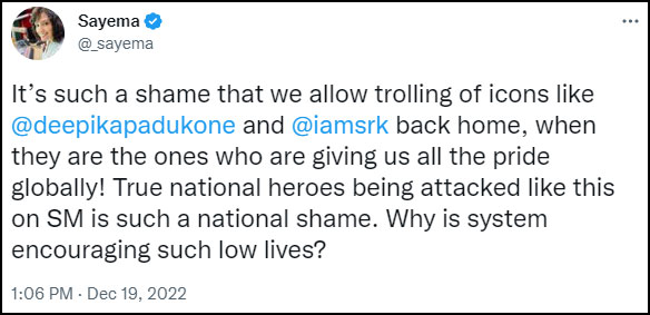 Many obvious members of the liberal gang jumped in and took the opportunity to mention that Padukone represented India on an international stage. RJ Sayema said, “It’s such a shame that we allow trolling of icons like Deepika Padukone and Shah Rukh Khan back home when they are the ones who are giving us all the pride globally! True national heroes being attacked like this on SM is such a national shame. Why is the system encouraging such low lives?”