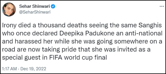 Even Pakistanis took a dig over the issue. Pakistani Twitter user Sehar Shinwari said, “Irony died a thousand deaths seeing the same Sanghis who once declared Deepika Padukone an anti-national and harassed her while she was going somewhere on the road are now taking pride that she was invited as a special guest in FIFA world cup final.”