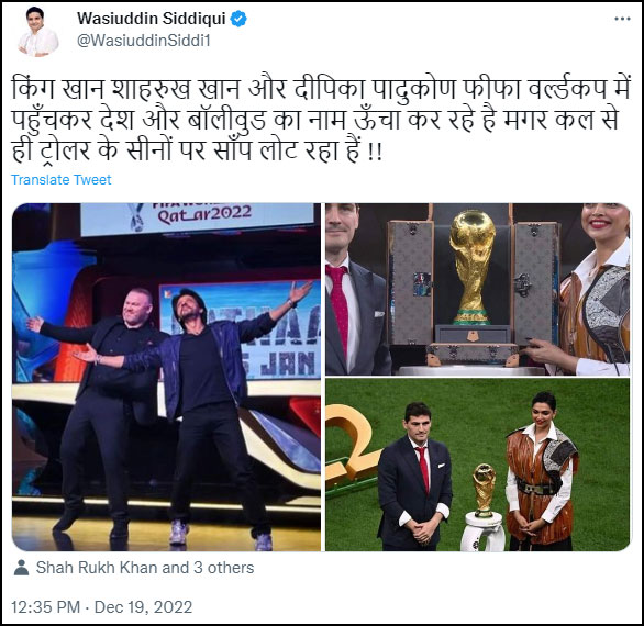Salar-e-hind ‘journalist’ Wasiuddin Siddiqui said, “King Khan, Shah Rukh Khan and Deepika Padukone are making India and Bollywood proud at FIFA. Since yesterday, snakes have been rolling on the chest of the trolls.”