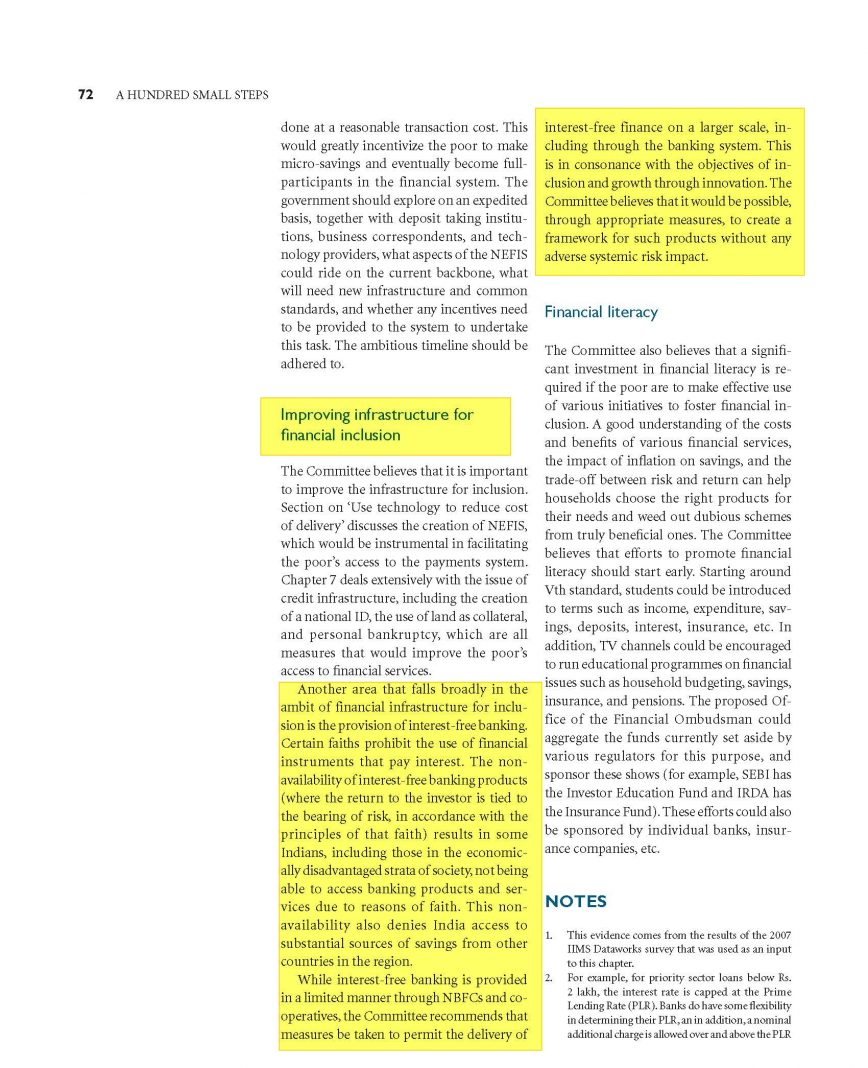 On page 72 of this report, there is a section titled “Improving infrastructure for financial inclusion”, where the idea of interest-free banking was discussed. A para in that section reads, “Another area that falls broadly in the ambit of financial infrastructure for inclusion is the provision of interest-free banking. Certain faiths prohibit the use of financial instruments that pay interest. The nonavailability of interest-free banking products (where the return to the investor is tied to the bearing of risk, in accordance with the principles of that faith) results in some Indians, including those in the economically disadvantaged strata of society, not being able to access banking products and services due to reasons of faith. This nonavailability also denies India access to substantial sources of savings from other countries in the region.”
