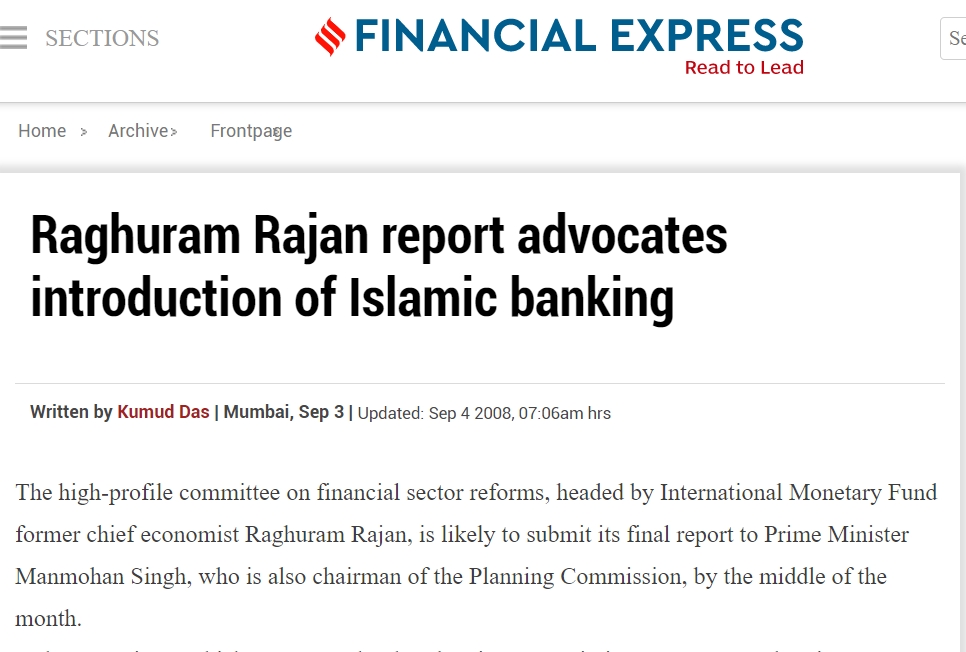 It is interesting to note that now ‘fact-checker’ Md Zubair is claiming that Raghuram Rajan didn’t propose Islamic banking, while the proposal of the committee was widely reported in the year 2008 itself. For example, a September 2008 report by Financial Express said in the headline: Raghuram Rajan report advocates introduction of Islamic banking.