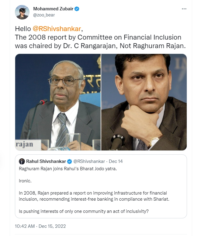 In his tweet, Zubair wrote, “The 2008 report by Committee on Financial Inclusion was chaired by Dr. C Rangarajan, Not Raghuram Rajan.” But the fact is that, Rahul Shivshankar didn’t even claim that the Islamic Banking was proposed in the report by Committee on Financial Inclusion. The Times Now editor wrote that Rajan had prepared a report on “improving infrastructure for financial inclusion”, where he had recommended interest-free banking.