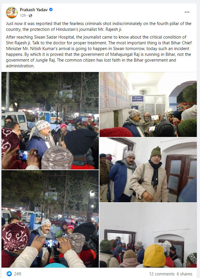 In a Facebook post, Yadav said, “I came to know about the critical condition of journalist Rajesh and requested a doctor for proper treatment. Notably, Bihar Chief Minister Nitish Kumar is coming to Siwan tomorrow and such an incident happened today. It proves that jungle raj prevailed in the state. The common citizen has lost faith in the Bihar government and administration.”