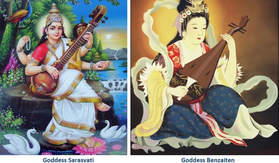 Benzaiten or Benten is one of numerous Vedic gods and goddesses who made their way to Japan via ancient and mediaeval Buddhist books and teachings, adopting local forms. These are a blend of Hinduism, Buddhism, and Shintoism.