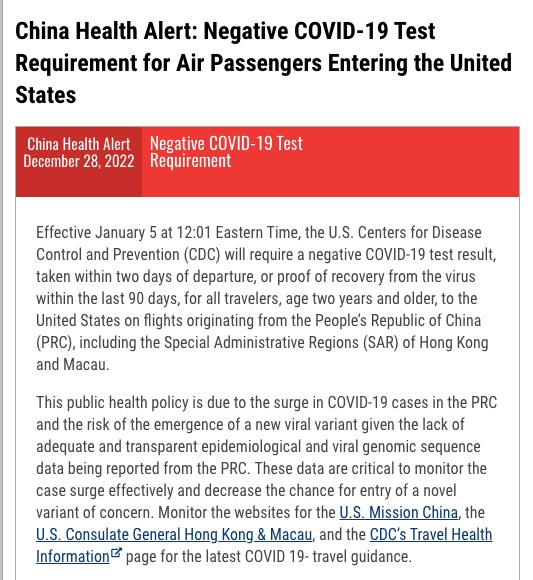 United States: On December 28, 2022, announced that it will require COVID-19 tests for travellers from China from January 5 onwards. All air passengers aged two and above will be required to undergo a negative test no later than two days before departure from China, Hong Kong, or Macau. According to the Centers for Disease Control and Prevention, Americans should reconsider travelling to China, Hong Kong, and Macau.