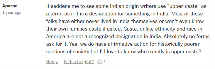 A reader, Aparna, said, “It saddens me to see some Indian origin writers use “upper-caste” as a term as if it is a designation for something in India. Most of these folks have either never lived in India themselves or won’t even know their own families’ caste if asked. Caste, unlike ethnicity and race in America, is not a recognised designation in India. Absolutely no forms ask for it. Yes, we do have affirmative action for historically poorer sections of society, but I’d love to know who exactly is upper caste?”