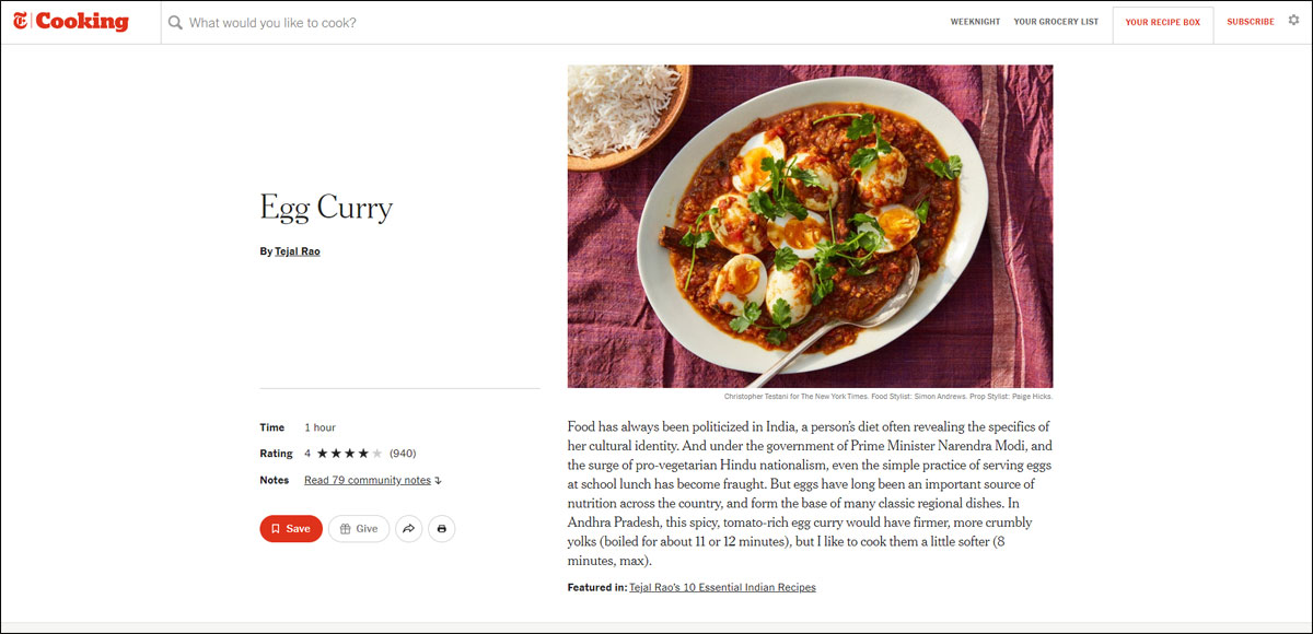 When OpIndia checked the recipe to confirm if it was actually written that way, we found the allegations were true. The recipe read, “Food has always been politicised in India, a person’s diet often revealing the specifics of her cultural identity. And under the government of Prime Minister Narendra Modi and the surge of pro-vegetarian Hindu nationalism, even the simple practice of serving eggs at school lunch has become fraught. But eggs have long been an important source of nutrition across the country and form the base of many classic regional dishes.” This particular recipe was from 2020 and featured in ‘Tejal Rao’s 10 Essential Indian Recipes’.