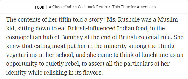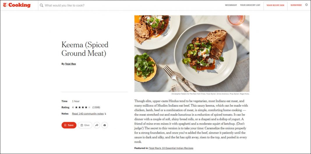 In her column where the two recipes were mentioned, she wrote, “India is currently struggling with a powerful wave of Hindu nationalism that threatens its Muslim population with deadly violence. The news is hard to ignore, even in a food story: Hindu supremacists, who push a narrow definition of Indianness, also push a narrow definition of India’s food culture.”