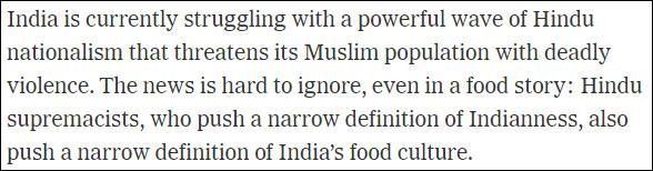 The NYT recipe: “Under the government of Prime Minister Narendra Modi, and the surge of pro-vegetarian Hindu nationalism…”