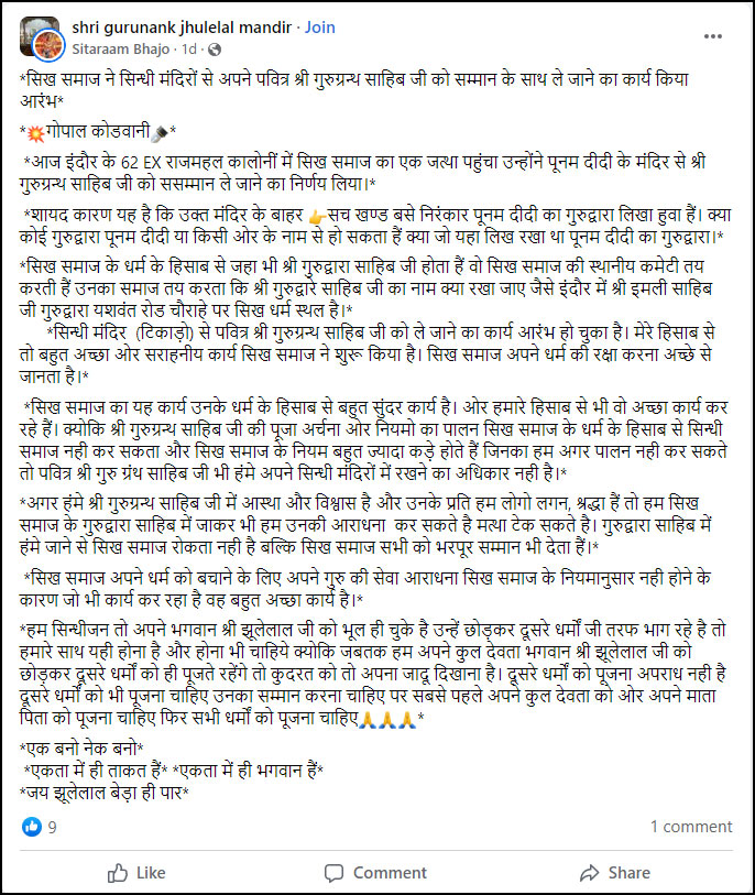 OpIndia reached out to members of the Sindhi community. Speaking to OpIndia, Prakash Rajdev, who was part of a 5-member committee of the Sindhi community, explained the matter. He said, “We, the members of the Sindhi community, have faith in Shri Guru Granth Sahib and worship Sikh Gurus. We have Guru Granth Sahib at Sindhi Thikanas (Thikana is Sindhi Temple) along with idols of Hindu Gods. When partition took place in 1947, members of the Sindhi community brought their Guru Granth Sahib with them safely. Around 30-35 per cent of Sindhis visit Thikanas and keep Path on celebrations and deaths. It has been going on for centuries.”