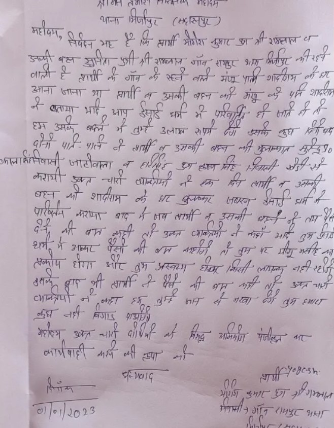 According to the complaint letter, Yogesh and his sister, who live in Raipur village under the jurisdiction of Mirzapur police station, were coerced into converting in lieu of money. Sunita was asked to travel to Manju’s residence. Shadiram, Manju’s husband, enticed both of them to convert their religion by offering them 3 lakh rupees. Accused Shadiram and his wife then summoned Surendra Prasad and Hari Singh t their residence, where the four of them converted the victims to Christianity. After conversion, the accused refused to pay the promised sum to the victims.