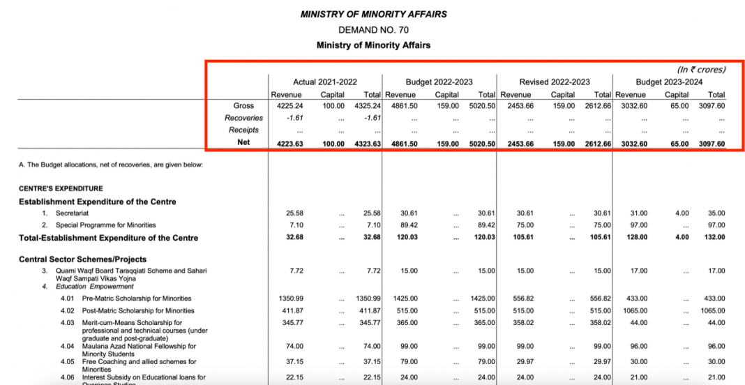 In the budget presented for 2023-24 by Finance Minister Nirmala Sitharaman, the Centre proposed to allot Rs 3,097.60 crore to the Ministry of Minority Affairs.