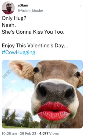 “Only Hug? Naah. She’s Gonna Kiss You Too. Enjoy This Valentine’s Day… #CowHugging,” tweeted a Twitter user @Aslam_khader. He posted a photoshopped image of a cow wearing lipstick, implying that the cow you embrace on February 14 will kiss you as well.
