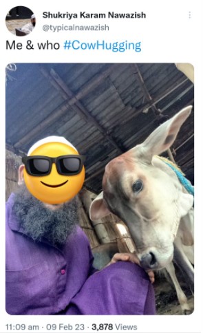“Me & who #CowHugging,” tweeted a Twitter handle @typicalnawazish. To mock the effort, the user posted an image of a cow with a morphed image of a person, whose face was covered but he was adorning a Muslim skull cap and sporting a beard.