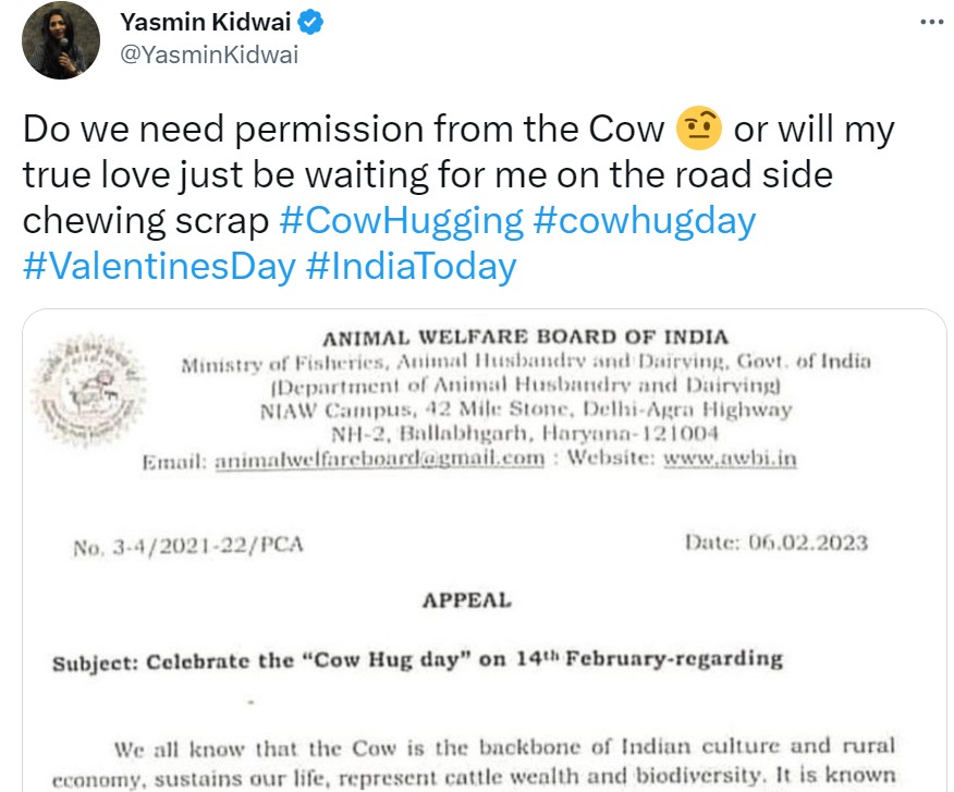 “Do we need permission from the Cow or will my true love just be waiting for me on the roadside chewing scrap #CowHugging#cowhugday#ValentinesDay#IndiaToday,” tweeted @YasminKidwai sharing a copy of the circular issued by the Animal Welfare Board.