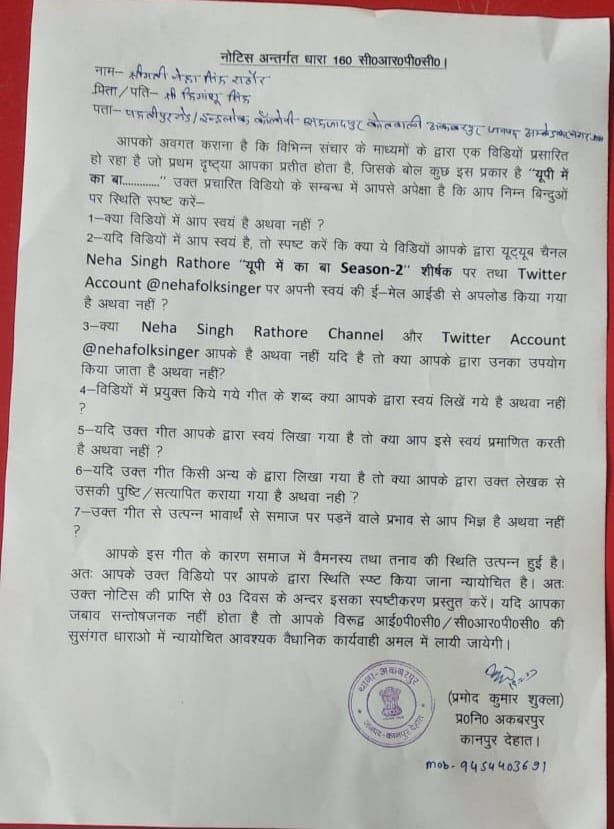 ‘यू पी में का बा!’ पर पुलिस का नोटिस..!#Nehasinghrathore #up @Uppolice @myogiadityanath @myogioffice #democracy pic.twitter.com/szZUsqvRCu