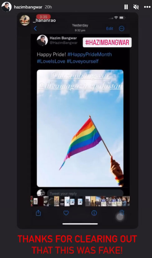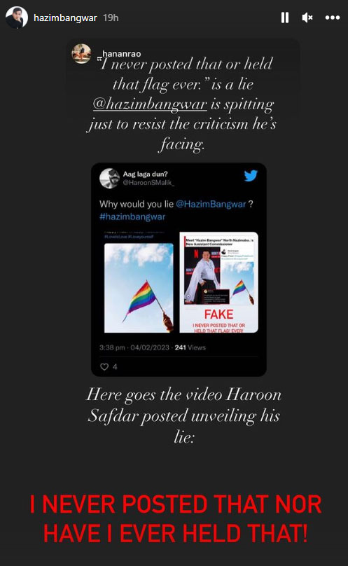 On February 3, netizens from Pakistan called out North Nizamabad’s new Assistant Commissioner Hazim Bangwar for putting up a pride flag on Twitter in 2018. Bangwar, however, has denied the allegations in an Instagram story. In the story he wrote, “I never posted that nor have I ever held that!!”.