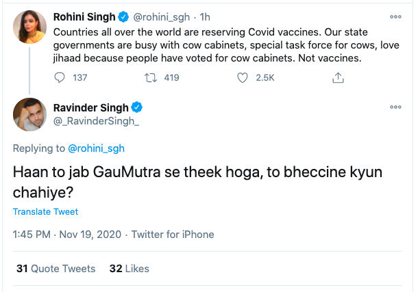 In November 2020, ‘author’ Ravinder Singh was seen using the language of the terrorists while mocking Covid-19 vaccines. Responding to ‘journalist’ Rohini Singh’s tweet on coronavirus vaccines, Ravinder Singh said why would we (Indians) need vaccines when we have Gaumutra (cow urine) as a cure.