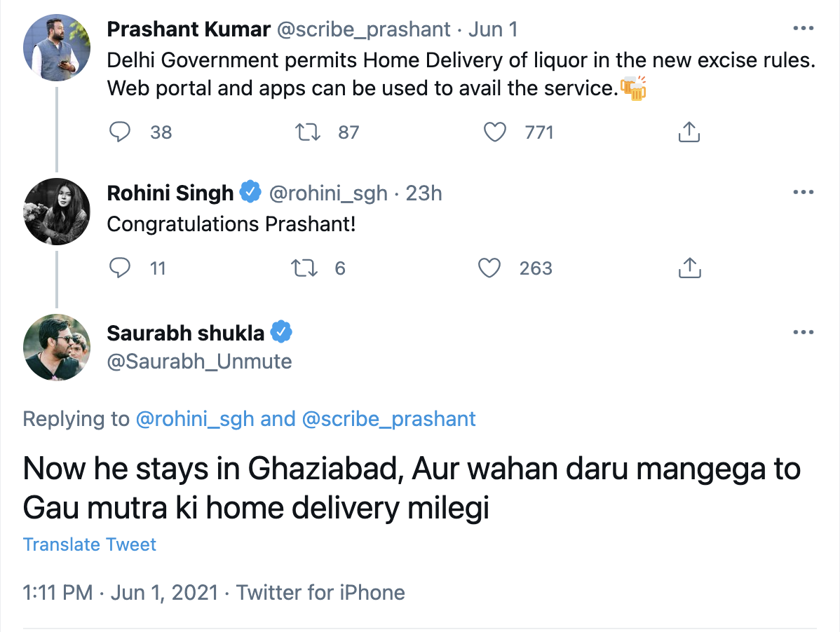 Rohini Singh congratulated Prashant on his tweet, to which Shukla responded that Prashant Kumar lived in Ghaziabad, where he would be delivered gau mutra at home instead of liquor.