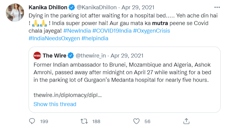 On April 27, 2021, she wrote, “If this situation doesn’t require urgency, then what does? lack of gau mutra? is that when we should panic?” This was the time when India was gripped by the deadly second wave of the Covid pandemic.