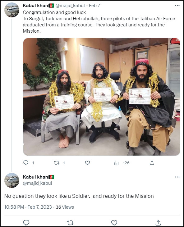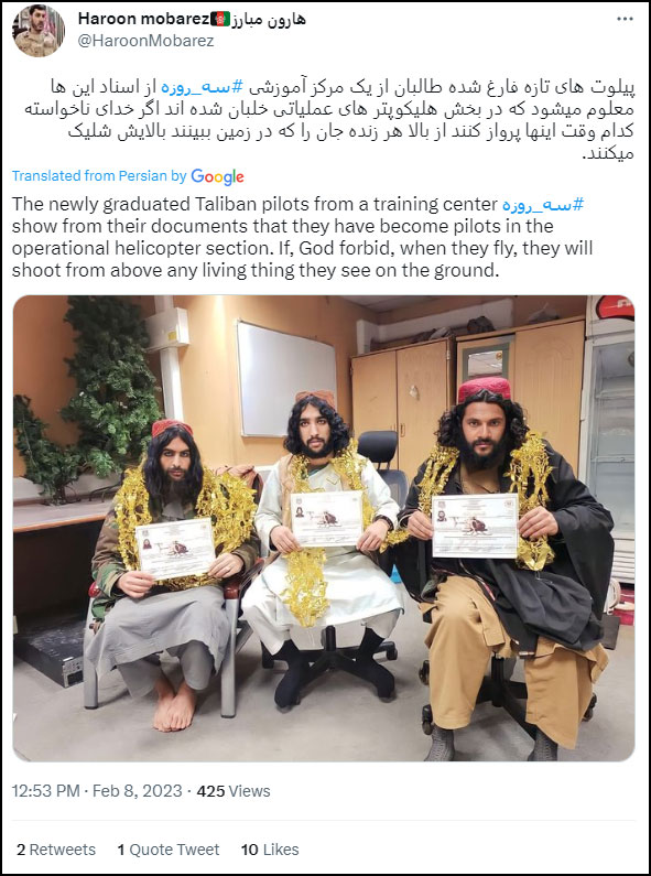 The photograph was also shared by Haroon Mobarez, General of the Ministry of Interior Commander of the 8th Brigade. He wrote, “The newly graduated Taliban pilots from a training centre. Their documents show that they have become pilots in the operational helicopter section. If, God forbid, when they fly, they will shoot from above any living thing they see on the ground.” (The tweet was translated from Persian to English using Google Translate.)
