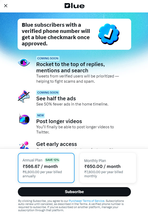 On February 9, Twitter launched the Blue subscription service for users in India. Besides India, the subscription service is also active in Brazil and Indonesia. There are two plans available for the subscribers using Twitter Web. The first plan is Annual Plan, where the users will be charged Rs 6,800 per year, billed at Rs 566.67 per month. The second plan is Monthly Plan, where users will have to pay Rs 650 per month, which will tune to Rs 7,800 per annum.