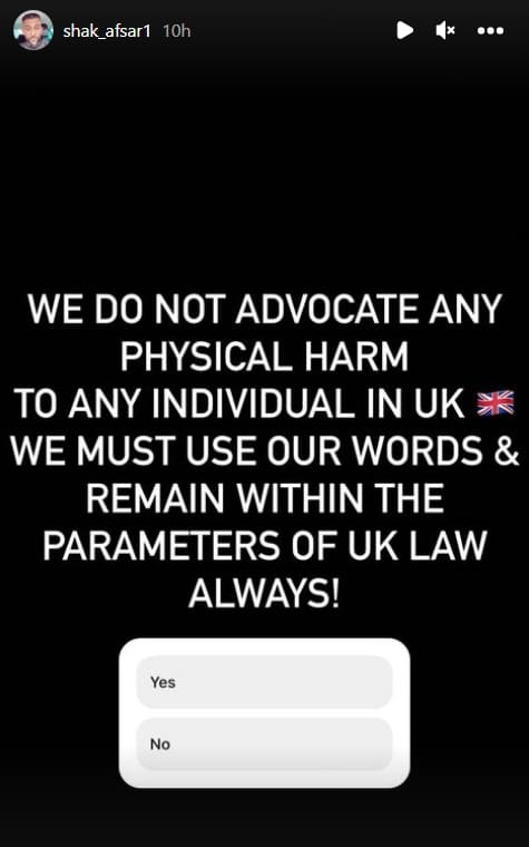 After his Instagram story labelling Hindus as ‘target practice’ went viral on social media, Shakeel Afsar claimed innocence. “We do not advocate any physical harm to any individual in the UK. We must use our words & remain within the parameters of the UK law always!”