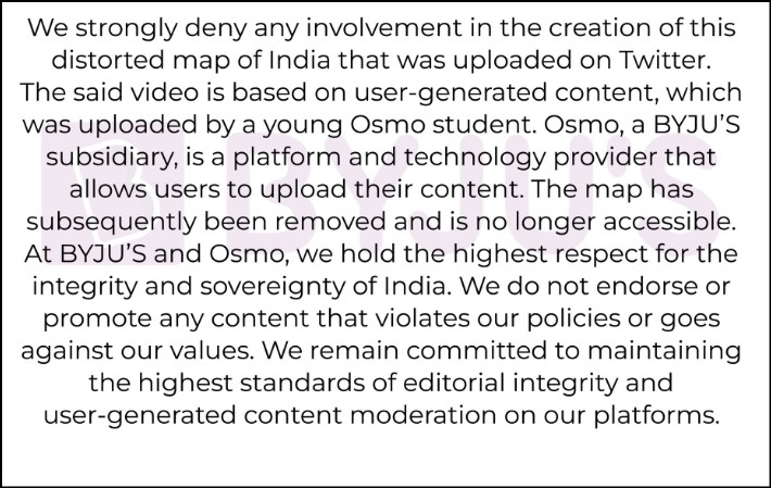 The widespread backlash on social media prompted Byjus to respond to the tweet. The company issued a statement denying any involvement in the creation of the distorted map of India that was uploaded on Twitter.