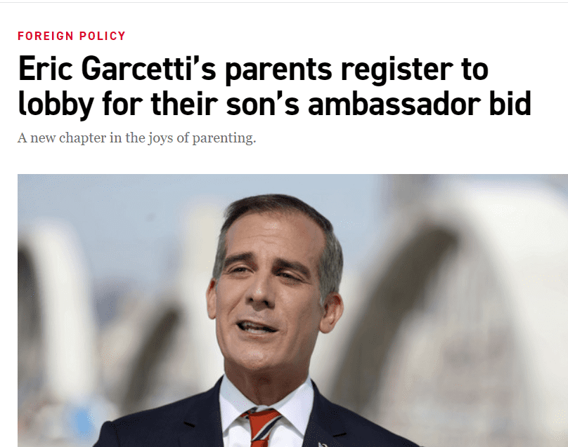 After witnessing their son’s career in jeopardy, Politico reported that Eric Garcetti’s parents Sukey and Gil Garcetti came to his rescue. They hired a national lobbying firm (McGuireWoods Consulting) in April 2022 to advance his ambassador nomination in the US Senate.