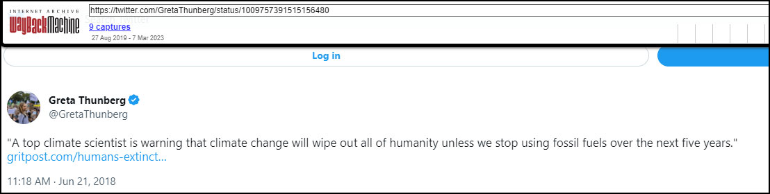 In the now-deleted tweet, Greta Thunberg wrote, “A top climate scientist is warning that climate change will wipe out all of humanity unless we stop using fossil fuels over the next five years,” while quoting a now-deleted article by Gritpost.com. The website no longer exists.