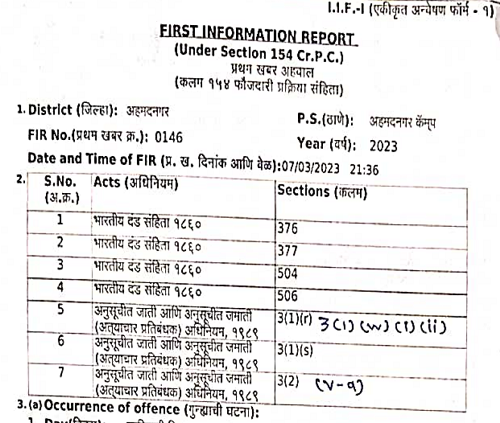 The complaint in the case has been registered under IPC sections 376 (rape), 377, 504 (insult intended to provoke breach of the peace), 506 (criminal intimidation) and also under sections 3(1)(r), 3(1)(s), 3(2) of the Scheduled Castes and the Scheduled Tribes (Prevention of Atrocities) Act, 1989.
