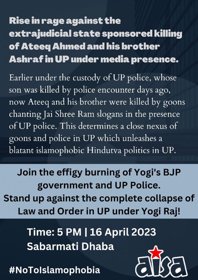 Moreover, the poster reads that earlier under the custody of UP police, Atiq Ahmed’s son was killed and now Atiq Ahmed and his brother Ashraf have been killed by “Jai Shri Ram” chanting goons in the presence of UP Police. The AISA poster asserted that there is some sort of ‘nexus’ of goons and UP Police aimed at unleashing “blatant Islamophobic Hindutva politics in UP.”