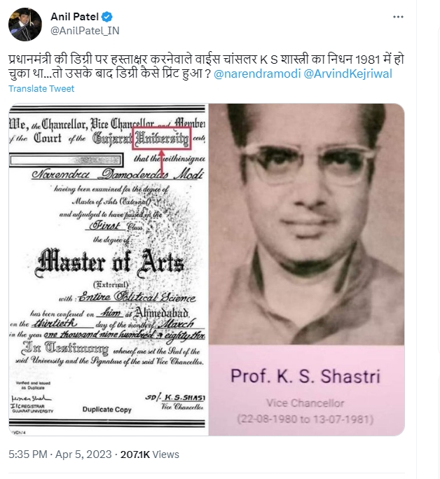 He posted a copy of the MA Degree released by BJP in 2016, and a photograph of Prof K S Shastri. Under the photo, his name, the words Vice Chancellor, and below that 22-08-1980 to 13-07-1981 is written in brackets. Based on it, Anil Patel claimed that KS Shastri died in 1981, therefore he could not have signed the degree certificate issued in 1983.