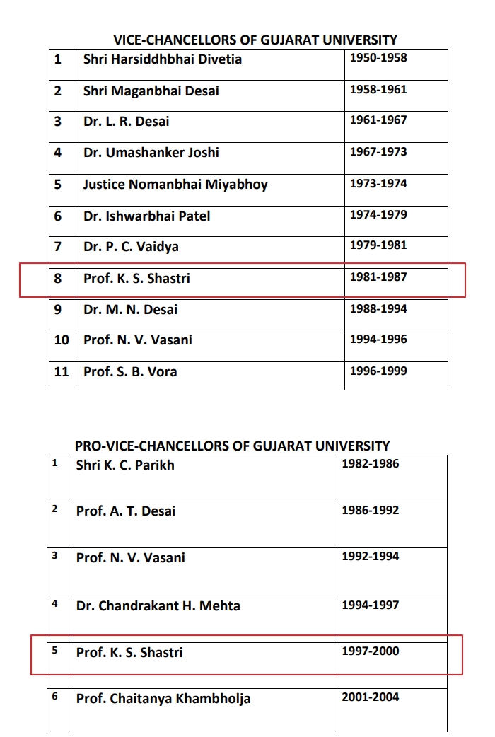 The date range 22-08-1980 to 13-07-1981 actually refers to the tenure of Shastri as the Vice Chancellor, but not of Gujarat University. He was the vice-chancellor of Veer Narmad South Gujarat University in Surat during this period. In fact, the image of Shastri with his name and dates has been taken from the University’s website listing its former VCs.