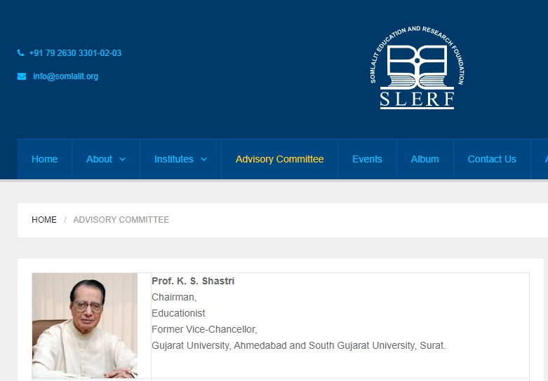 The latest brochure and the mandatory disclosure of the Som-Lalit Institute of Management Studies mention KS Shastri’s name as the chairman of the advisory committee.