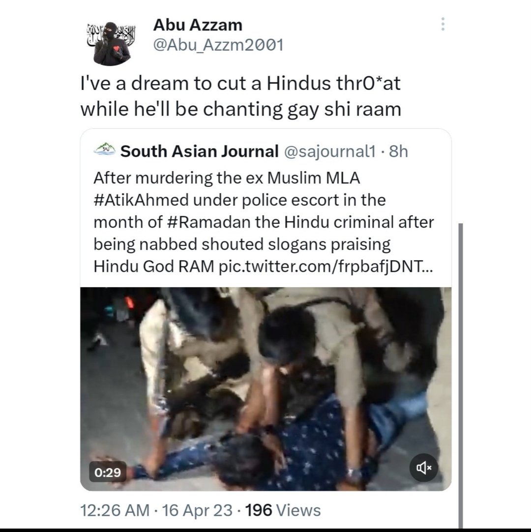“Indian police arrested Atiq Ahmed and allowed Hindu gangster to kill both arrested brothers while their hands are tied by police in front of media. This is end of every Muslim who raises their voice against Hindu terrorism in #India,” wrote another Islamist.