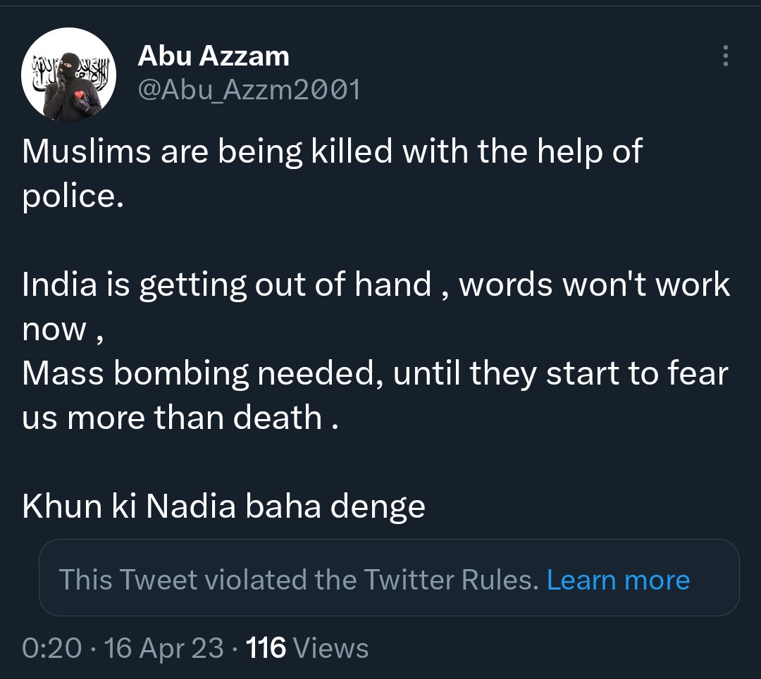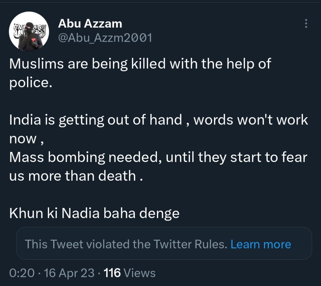 Meanwhile, a Twitter user named ‘Abu Azzam’ threatened to execute mass bombings in India so that the Hindu community develops ‘more fear of Muslims than death.’ It had tweeted, “Khun Ki Nadia bana denge (We will unleash rivers of blood).