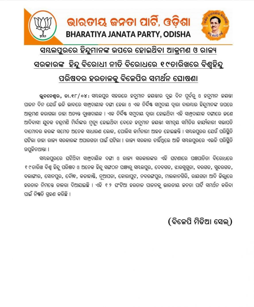 In an official statement, the BJP stated that a peaceful procession by Hindus came under repeated attacks in Sambalpur by a particular community and the local administration was unable to prevent it. In the subsequent incidents of violence, a tribal man named Chandramani Mirdha has been brutally killed by goons while many Hindu leaders and police personnel have been injured. The BJP has condemned the law and order situation in the state under the BJD government.