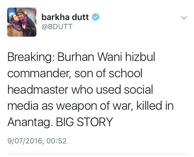 “Breaking: Burhan Wani hizbul commander, son of school headmaster who used social media as weapon of war, killed in Anantnag. BIG STORY,” she had tried to garner sympathy for the terrorist after he was neutralised by Indian security forces.