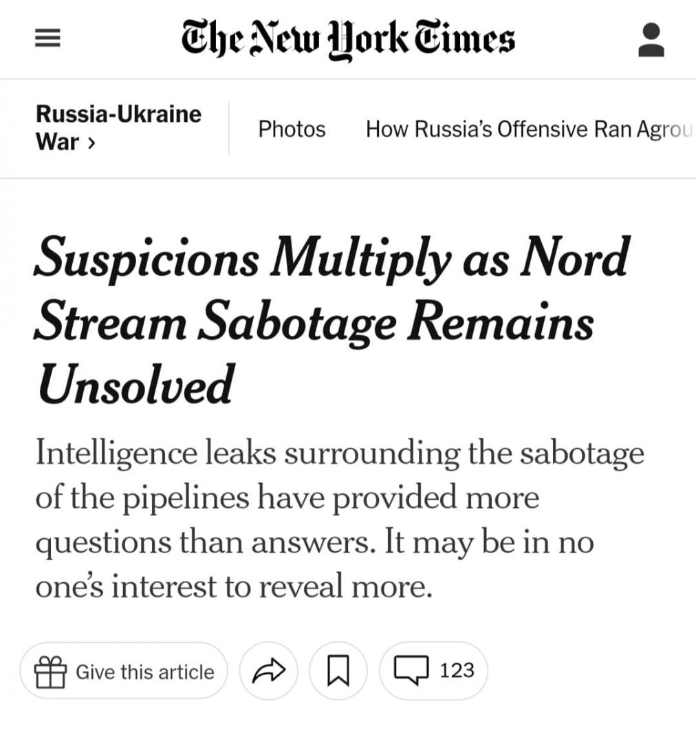 The sudden change in the stance of The New York Times comes two days after Pulitzer Prize-winning journalist Seymour Hersh called out the American daily for parroting the CIA (US intelligence agency)’s version of the underwater bombing of Nord Stream 1 and Nord Stream 2 gas pipelines.