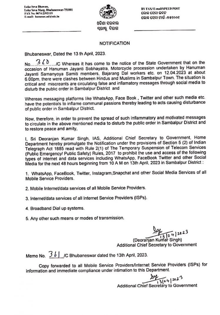 As per the latest reports, internet services have been suspended in the Sambalpur district for 48 hours. The official order says that violent clashes have happened between Hindu and Muslim groups and false and inflammatory messages are being circulated through social media.
